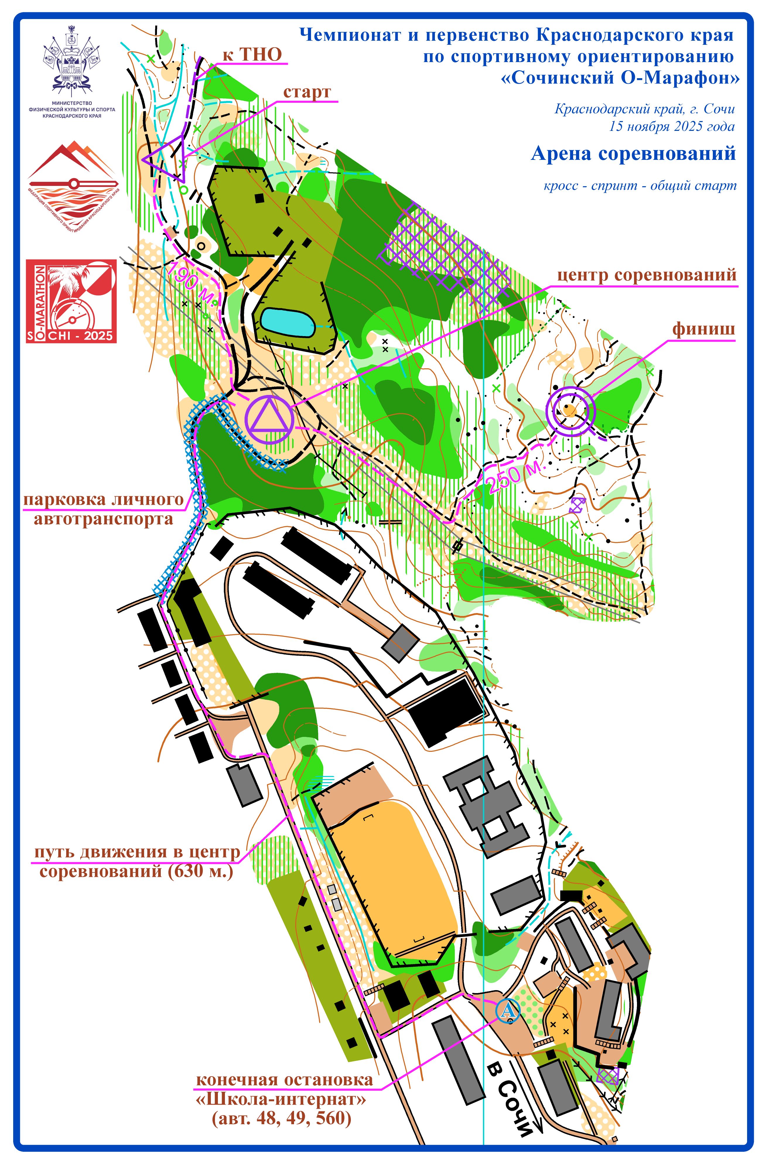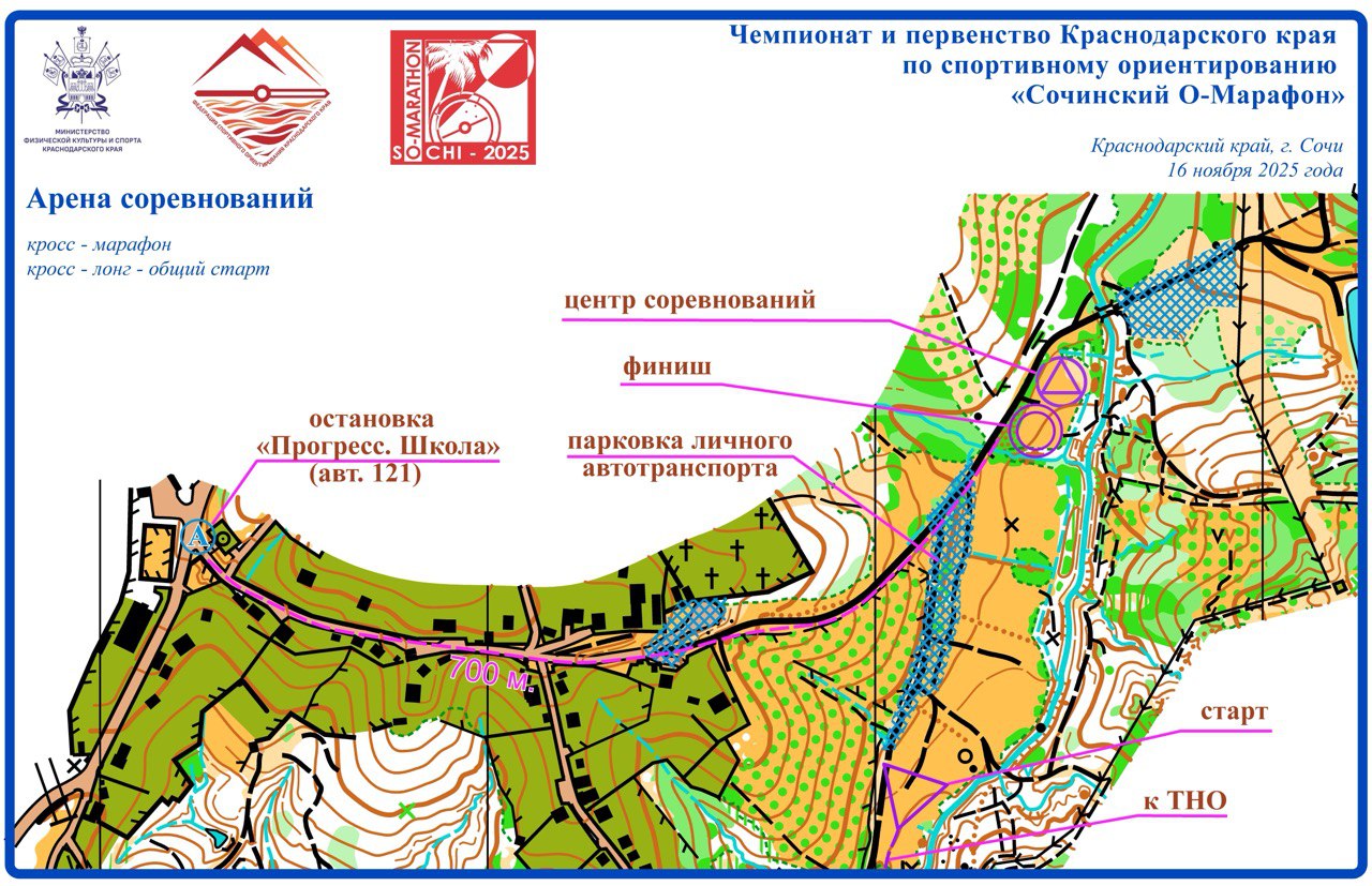 15 и 16 ноября 2025 года в г. Сочи на картах м-на Кудепста и с. Прогресс состоялись Чемпионат и первенство Краснодарского края по спортивному ориентированию «Сочинский О-Марафон» в дисциплинах "кросс-спринт-общий старт" и "кросс-лонг-общий старт".